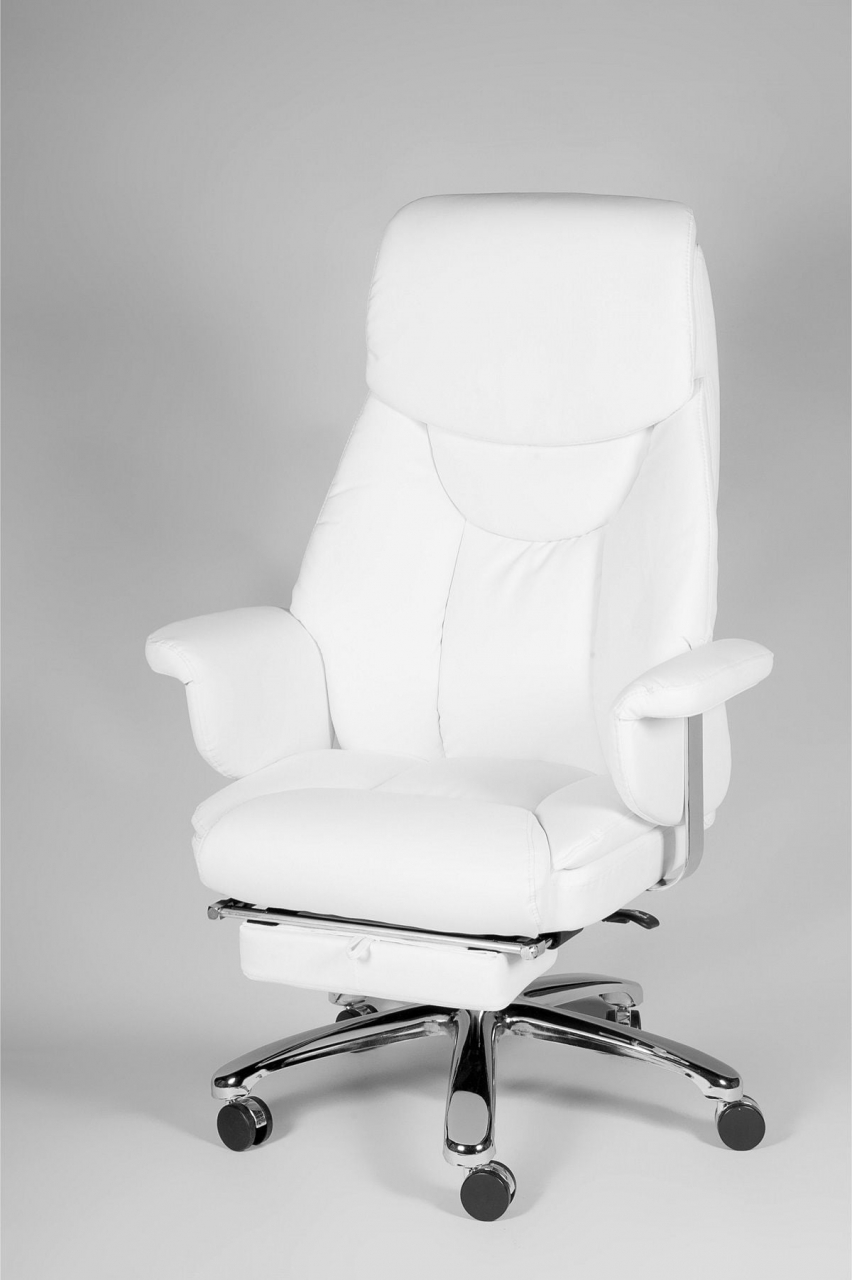 Выдвижная подножка для поддержки ног позволяет принять лежачее положение в минуты отдыха, снимает нагрузку с позвоночника, улучшает кровообращение. Хромированный газ-патрон, ролики с вставкой "хром", хромированные части подлокотника делают модель стильной, с элементами дизайна в стиле хай-тек. Кресло подойдет людям высокого роста, плотной комплекции