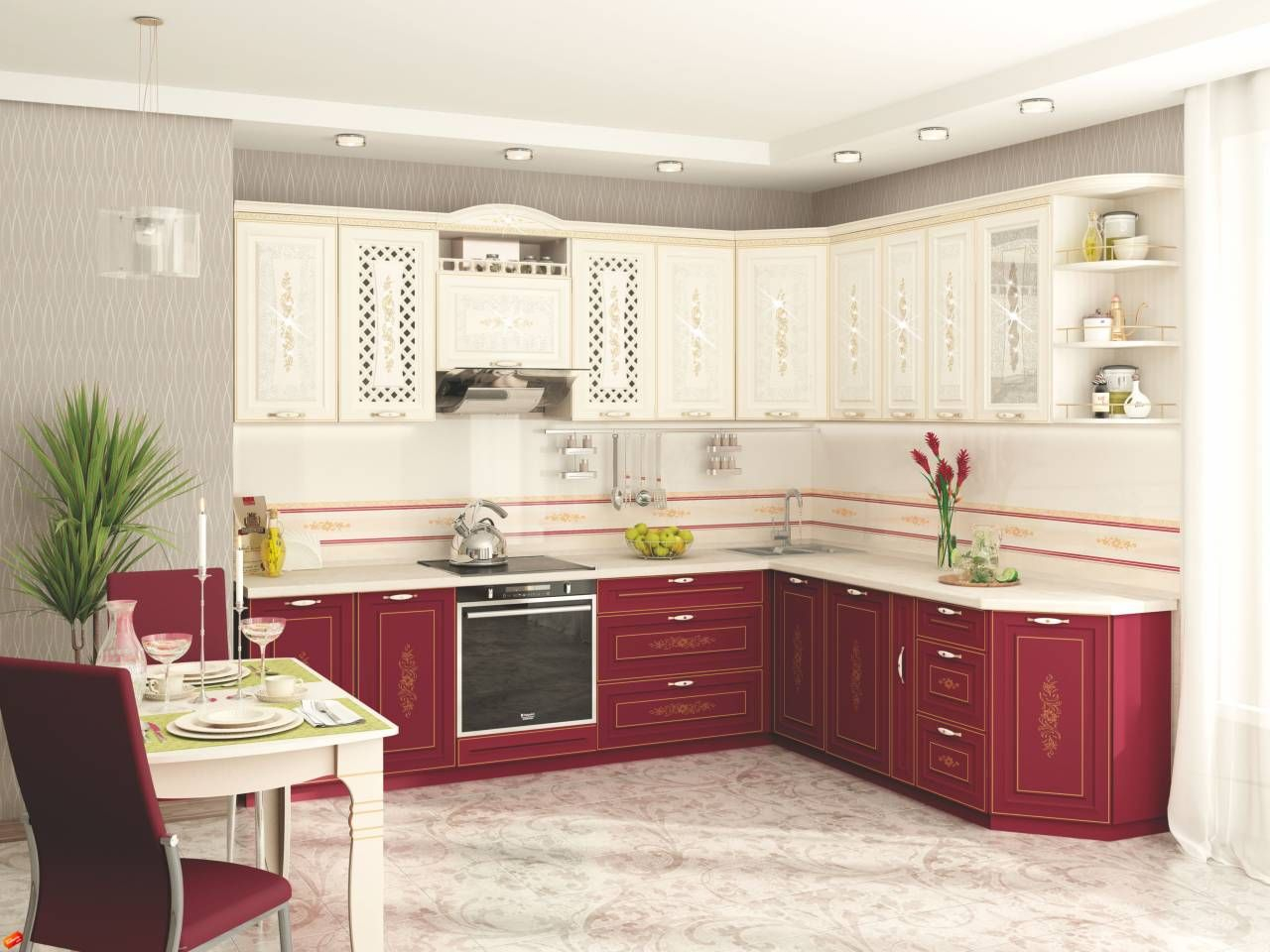 Стильная и яркая кухня Виктория украшена, ажурным 3D эффектом и рисунком патиной с кристаллами "SWAROVSKI".