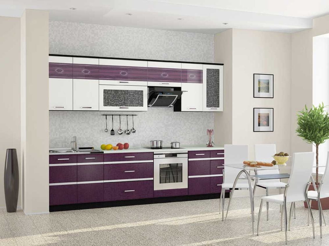 Набор мебели для кухни «Палермо» создан в современном стиле. Насыщенные фиолетовые вставки из стекла подчеркивают белизну фасадов и текстурный рисунок на них. Этот контраст в цветовых решениях особенно понравится тем, кто идет в ногу со временем.