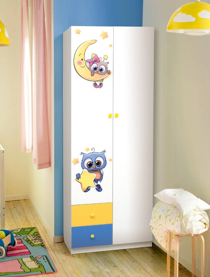 Шкаф 2-х дверный комбинированный с ящиками, зеркалом и фотопечатью Совята 2.1 Белый/Желтый/Синий_204940