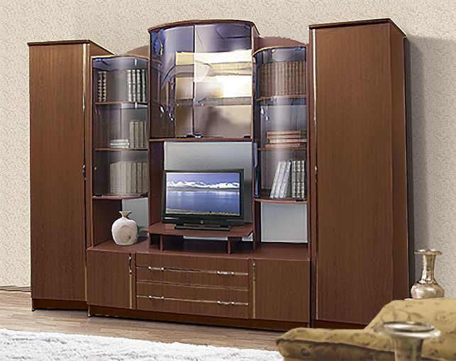 Стена для гостиной, с элементами из стекла. Плотяные шкафы по сторонам. Слевой стороны со штангой, справо с полками. Внизу 2 выдвижных ящика и 2 отделения без полок. Ниша под ТВ: ширина - 760 мм, высота - 795 мм.