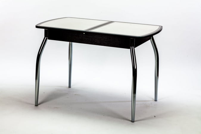 Необычное сочетание ЛДСП, кожзама и закаленного стекла в исполнение столешницы придаст шарм вашей кухне. Механизм раскладки- синхронно -раздвижной (бабочка). В разложенном виде стеклянные половинки столешницы разделяет вставка из ЛДСП.