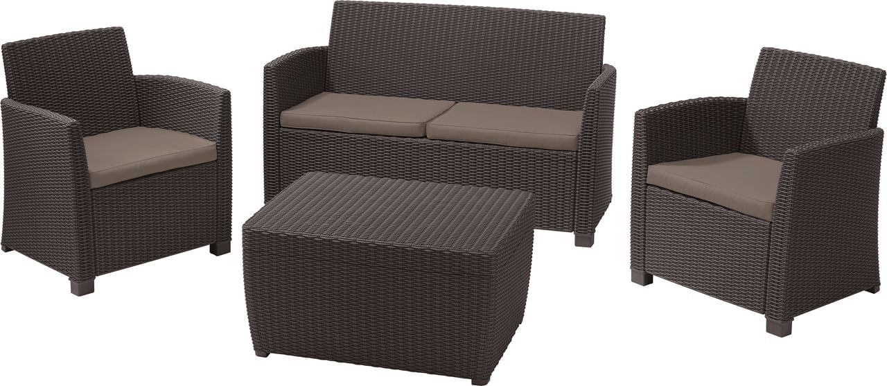 Удобный комплект мебели из искусственного ротанга производства фирмы KETER Group. Широкий диван позволяет поместится большому количеству людей, а высокие спинки мебели создают прекрасные условия для отдыха на открытом воздухе.